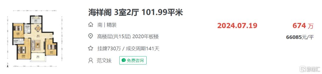 根据中介成交数据显示,今年7月海祥阁成交一套101.99平户型,成交总价674万/平,折合均价约6.6万/平。