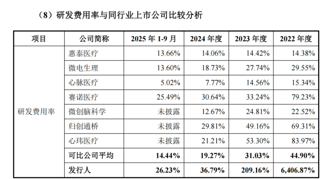 报告期内,公司研发费用率分别为6406.87%、209.16%、36.79%和26.23%,整体高于同行。公司解释,主要系发行人处于商业化初期,收入相对较低且保持较高水平的研发投入所致。2022年度和2023年度,公司研发费用率较高,主要系当期收入较低且2023年股份支付金额较高所致。