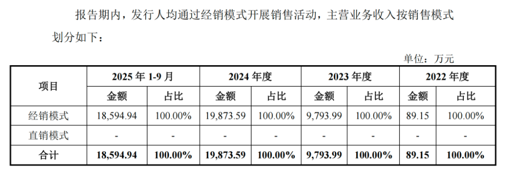 报告期内,公司采用全经销模式。这种销售模式虽然能帮助初创企业快速打开市场,但也暗藏着长期隐患。