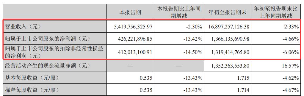 其中,公司第三季度实现营收54.2亿元,同比下降2.30%;净利润4.26亿元,同比下降13.42%;;扣非净利润4.12亿元,同比降幅达14.5%。意味着剔除政府补助等非经常性收益后,公司主营业务盈利能力进一步弱化。
