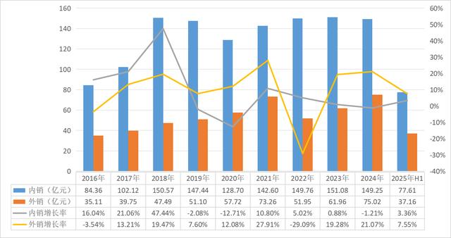 2025年上半年,苏泊尔外销营收达37.16亿元,同比增长7.55%.与2024年21.07%的增速相比,已经出现了较大幅度的下滑。