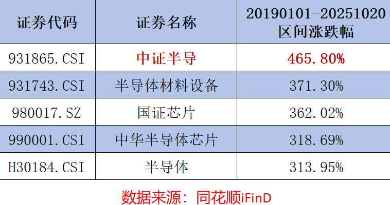 半导体产业自2022-2024年进入调整阶段后,目前正步入新一轮上行周期。数据显示,半导体设备ETF(561980)跟踪的中证半导在同类指数中表现突出,自2019年至2025年10月20日区间上涨465.80%,在新一轮周期中可能更具弹性。