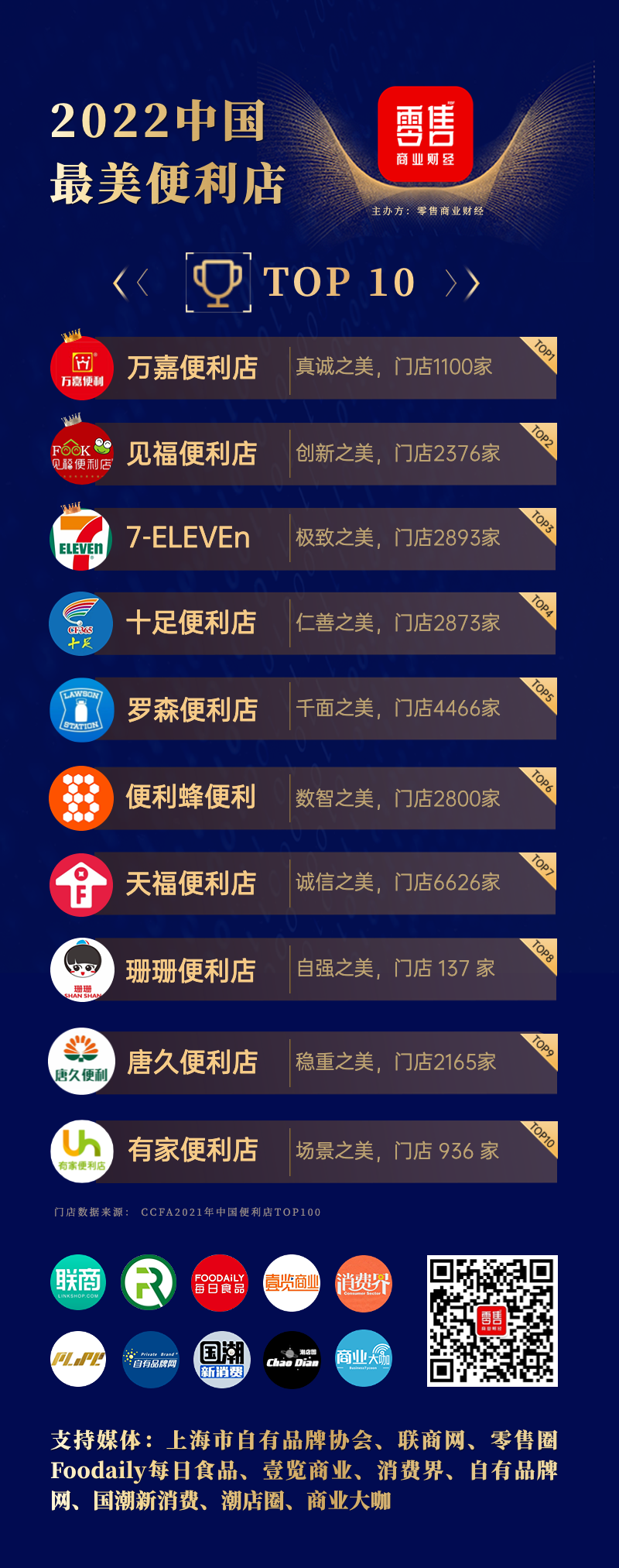 获得“中国十大最美便利店2022·Top10”称号的品牌分别是:万嘉便利店、见福便利店、7-ELEVEn、十足便利店、罗森便利店、便利蜂便利店、天福便利店、珊珊便利店、唐久便利店、有家便利店。