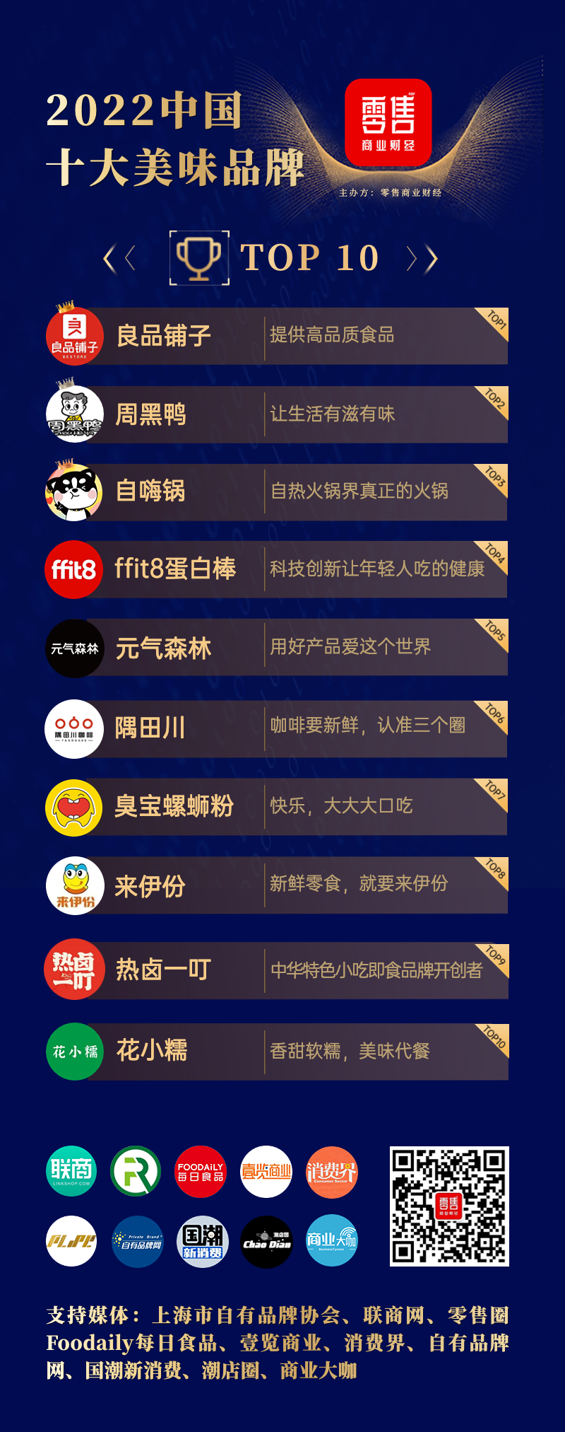 获得“中国十大美味品牌2022·Top10”称号的分别是:良品铺子、周黑鸭、自嗨锅、ffit8蛋白棒、元气森林、隅田川、臭宝螺蛳粉、来伊份、热卤一叮、花小糯。
