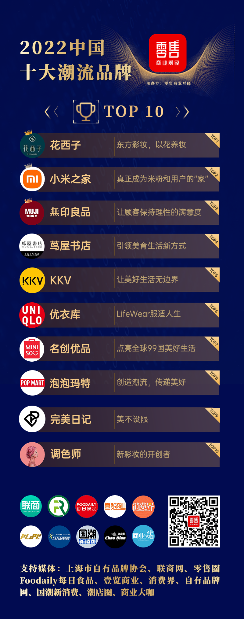 获得“中国十大潮流品牌2022·Top10”称号的分别是:花西子、小米之家、無印良品、茑屋书店、KKV、优衣库、名创优品、泡泡玛特、完美日记、调色师。