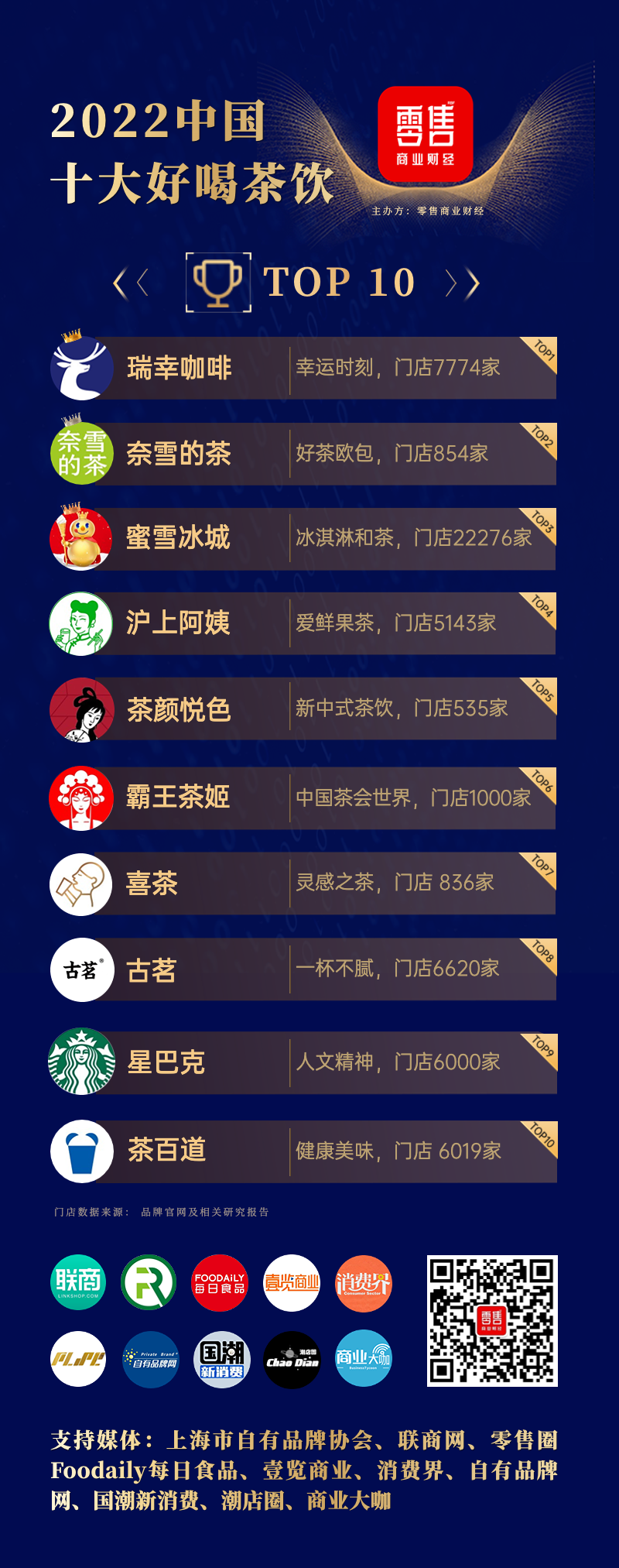 获得“中国十大好喝茶饮2022·Top10”称号的分别是:瑞幸咖啡、奈雪的茶、蜜雪冰城、沪上阿姨、茶颜悦色、霸王茶姬、喜茶、古茗、星巴克、茶百道。