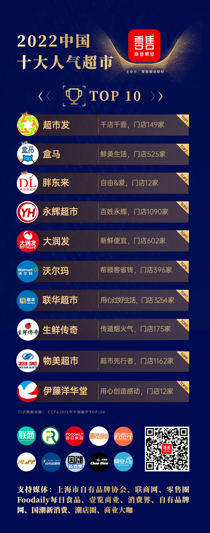 获得“中国十大人气超市2022·Top10”称号的品牌分别是:超市发、盒马、胖东来、永辉超市、大润发、沃尔玛、联华超市、生鲜传奇、物美超市、伊藤洋华堂。