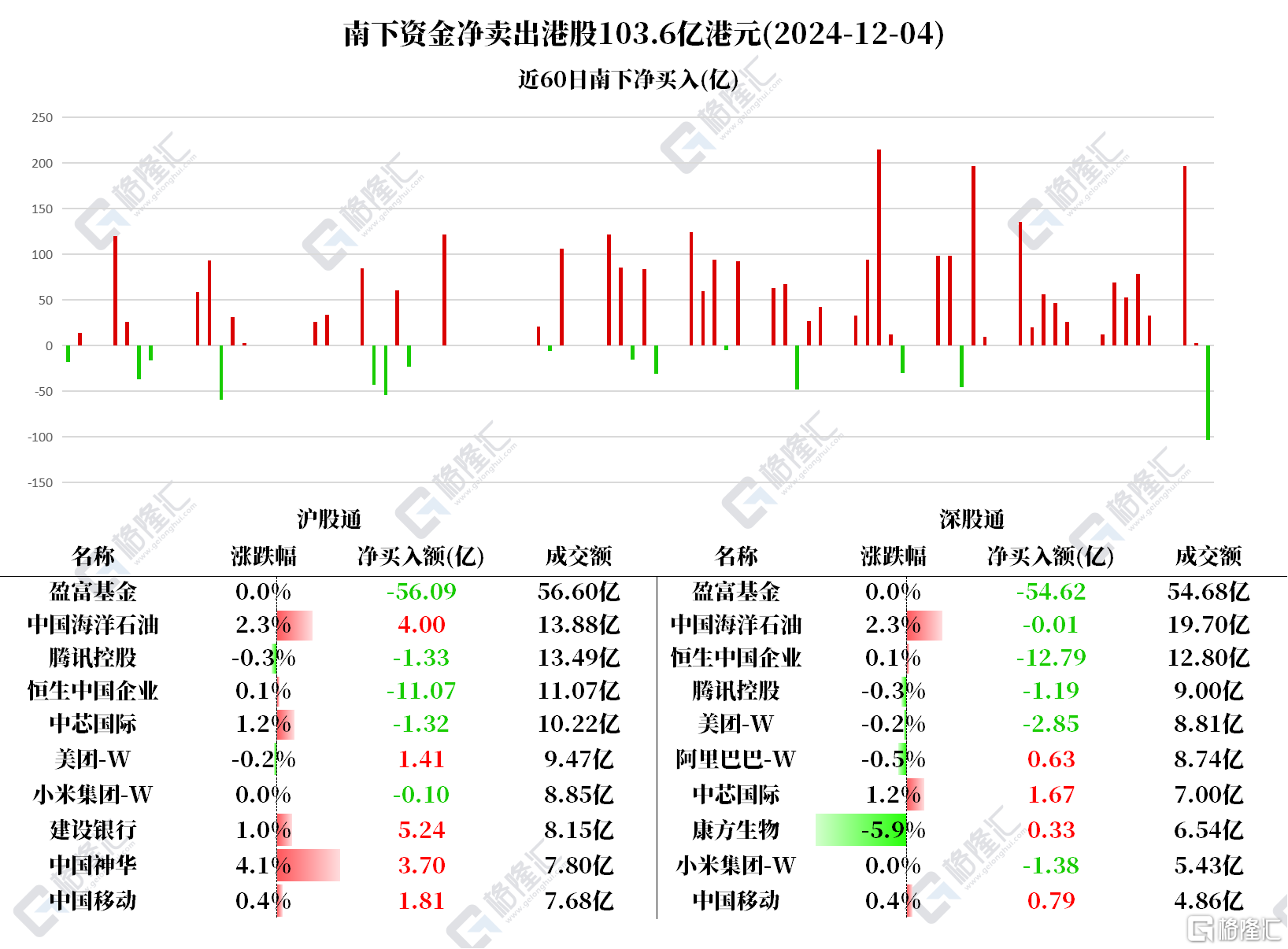 10、南下资金净卖出港股103.6亿港元,逆势加仓建行、中海油和神华;