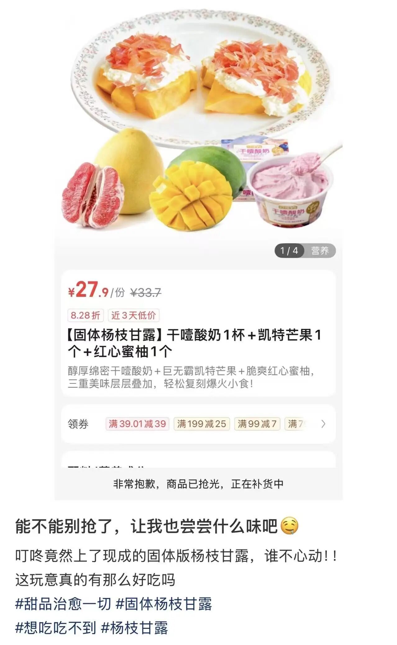 固体杨枝甘露同样迅速蹿红。它以半个芒果果肉做底,涂上浓稠的干噎酸奶,再搭配西柚粒、爆爆珠、西米等配料,经典饮品“杨枝甘露”摇身变为可以“嚼”着吃的甜品。《消费者报道》记者注意到,叮咚买菜已上线了制作固体杨枝甘露的食材组合装,产品上架后迅速售罄。