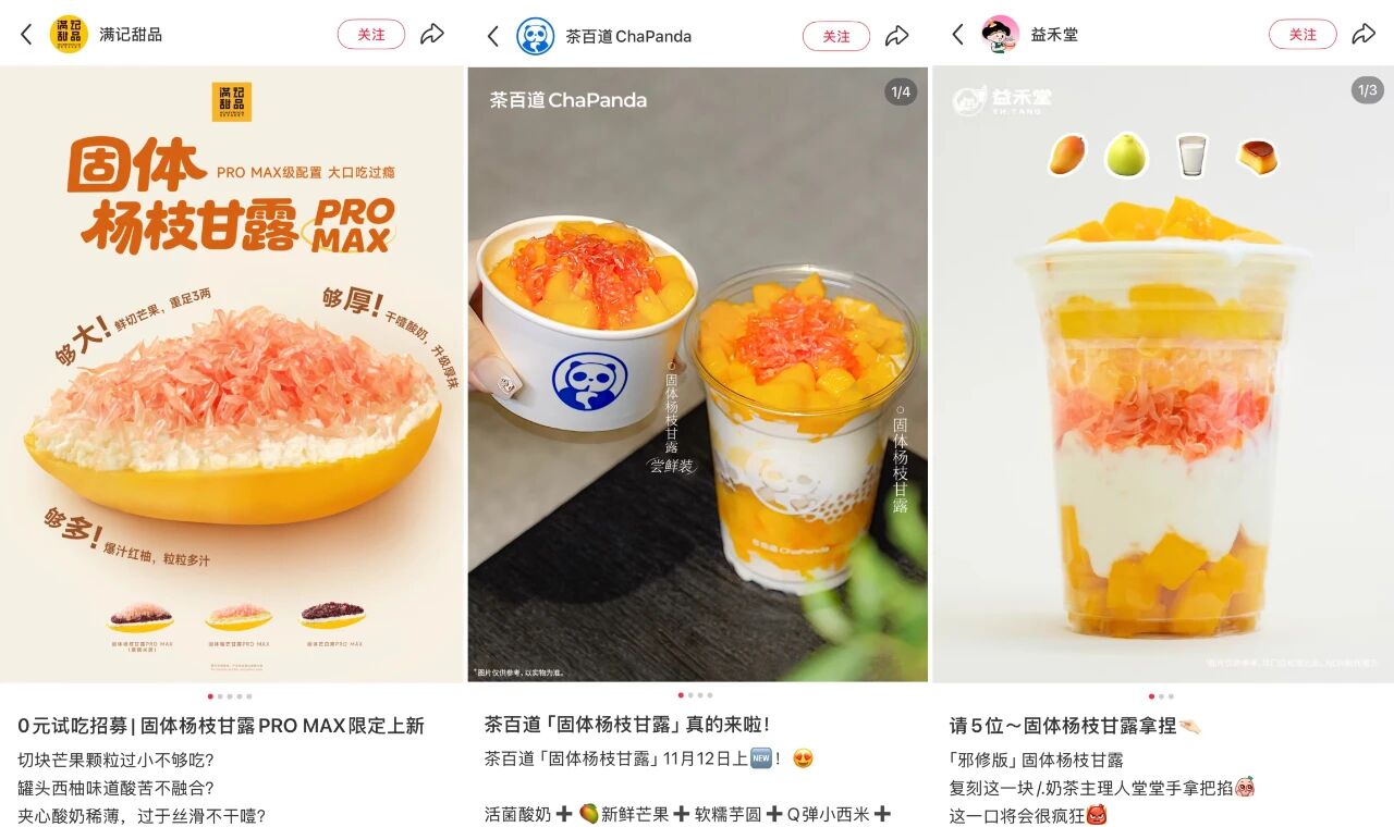 面对DIY热潮,也有网友表示不想自己动手,希望企业能推出“懒人版”固体杨枝甘露。满记甜品、茶百道、益禾堂等品牌迅速响应网友需求,推出成品版的固体杨枝甘露,一经上线便收获广泛关注,成为继饮品之后的又一爆款产品。据悉,茶百道的固体杨枝甘露上架首日,全国总销量近25万杯、多地门店一度“一杯难求”。