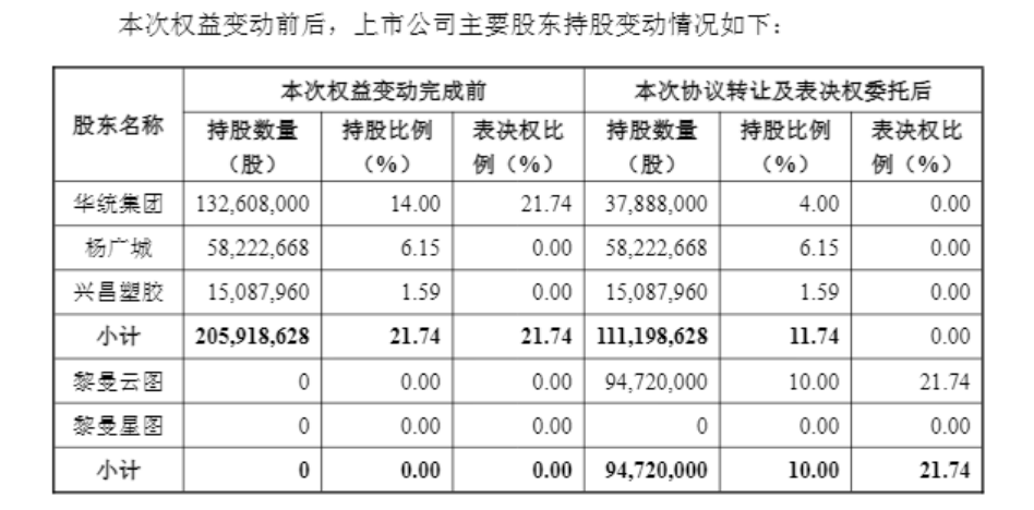 同日,黎曼云图与华统集团及其一致行动人杨广城、兴昌塑胶五金厂有限公司分别签署《表决权委托协议》,约定三者持有的公司11.74%股份对应的表决权不可撤销地委托给黎曼云图行使。
