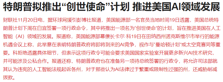 据财联社报道,美国能源部一名官员当地时间19日透露,美国总统特朗普计划下周在白宫签署一项行政命令,其中将推出一项名为“创世使命”的计划,旨在推进美国在人工智能(AI)领域的发展。