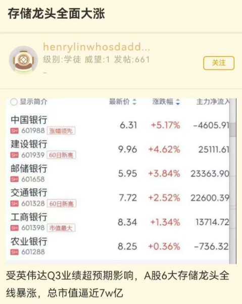 到A股这边,科技股高开被砸盘,然后拉银行板块撑指数,中国银行一度涨超5%创历史新高,早盘指数是红的,但又是4000多家下跌。然后就有一个段子“受英伟达q3业绩超预期影响,A股6大存储龙头全线暴涨,总市值逼近7w亿”,美股有英伟达,A股也有“银伟达”。