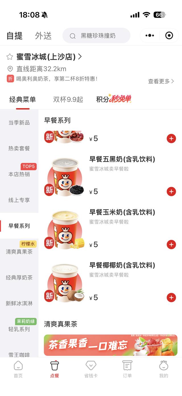 茶咖观察通过蜜雪冰城官方小程序进一步验证,发现杭州上沙店确实已上线“早餐系列”。目前产品包括早餐五红奶、早餐五黑奶、早餐玉米奶和早餐椰椰奶四款,售价均为5元,与爆料信息吻合。