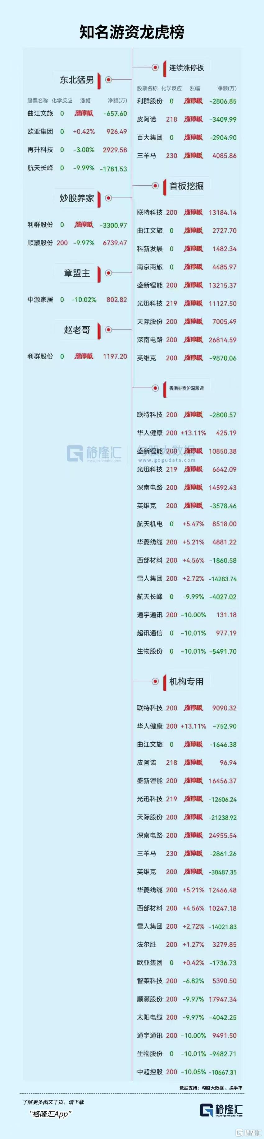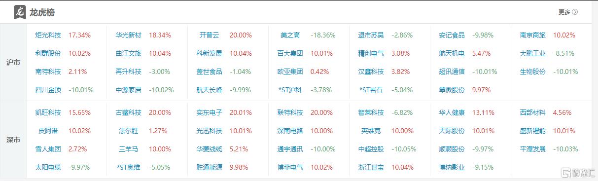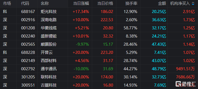 龙虎榜中涉及机构专用席位的个股中,单日净买入额前三为炬光科技、深南电路、华菱线缆,分别为2.91亿元、1.73亿元、1.25亿元。