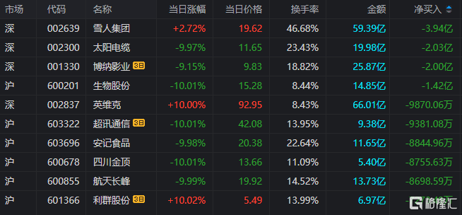 龙虎榜单日净卖出额前三为雪人集团、太阳电缆、生物股份,分别为3.94亿元、2.03亿元、1.42亿元。