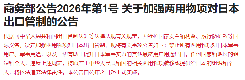 根据《中华人民共和国出口管制法》等法律法规有关规定,为维护国家安全和利益、履行防扩散等国际义务,决定加强两用物项对日本出口管制。