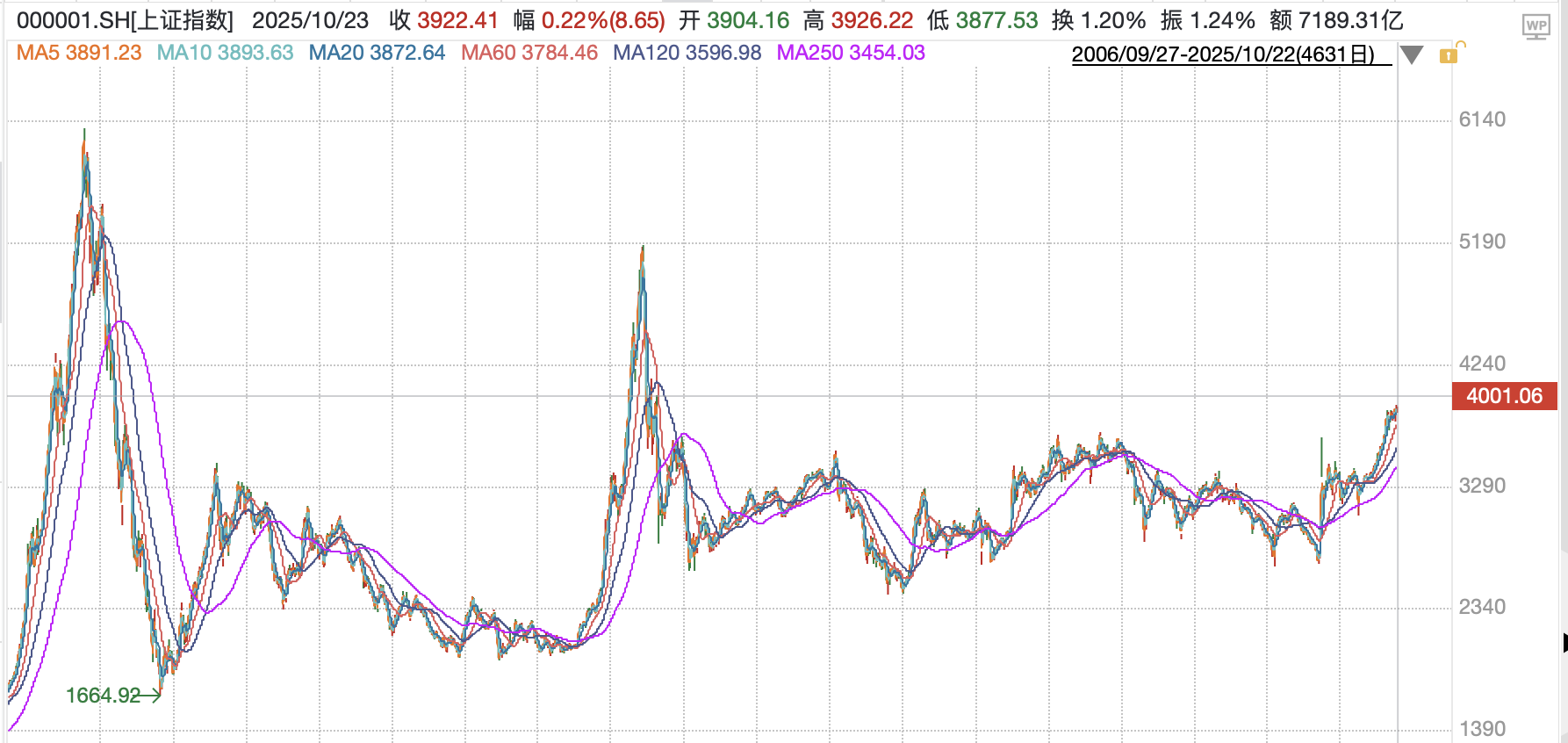 10月28日早盘,开盘不到一个小时,沪指突破4000点,盘中最高触达4010.73点,再度创下近十年来新高。这是沪指自2015年8月之后,时隔十年重新站上这一关键点位。