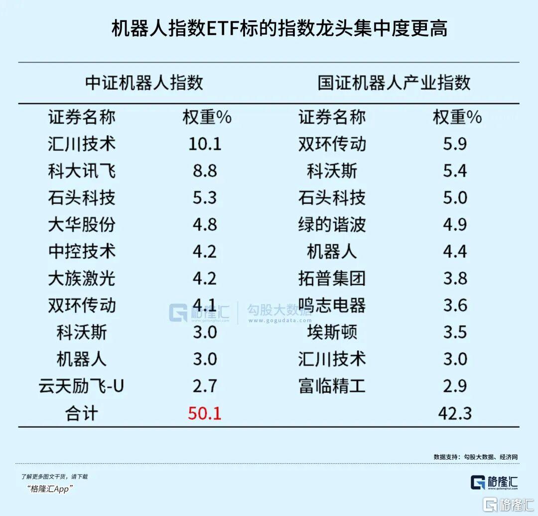 机器人指数ETF标的指数前十大成分股包括汇川技术、科大讯飞、石头科技、大华股份、大族激光、中控技术、双环传动、机器人、云天励飞-U、科沃斯,合计占比50.1%,指数龙头集中度更高。