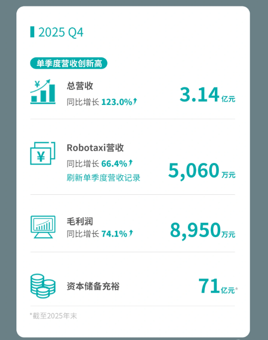 文远知行第四季度单季营收3.14亿元,同比暴涨123%,一举创下公司单季度营收新高;其中Robotaxi营收5060万元,同比增长66.4%,同步刷新单季度收入纪录;毛利润8950万元,同比增长74.1%;净亏损同比收窄34.2%;盈利效率持续提升。现金储备充裕,公司持有的现金、现金等价物、定期存款等各类资金总额达71亿元,为后续发展提供坚实保障。这些亮眼数据,充分印证了公司商业化模式的可行性与高效性,更释放出明确信号——文远知行自动驾驶商业化拐点已正式到来!