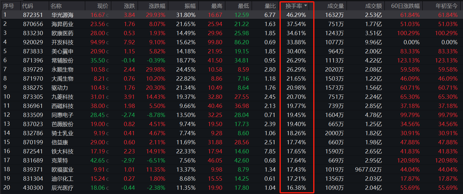 换手率前五的是,华光源海(872351)换手率46.29%居首,海晟药业(870656)换手率37.54%,欧康医药(833230)换手率34.61%,开发科技(920029)换手率33.88%,美心翼申(873833)换手率30.40%。
