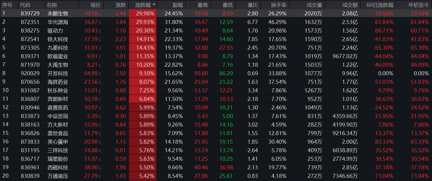 涨幅前五的是,永顺生物(839729)、华光源海(872351)30CM涨停,驱动力(838275)涨20.30%,铁大科技(872541)涨14.91%,九菱科技(873305)涨14.43%。