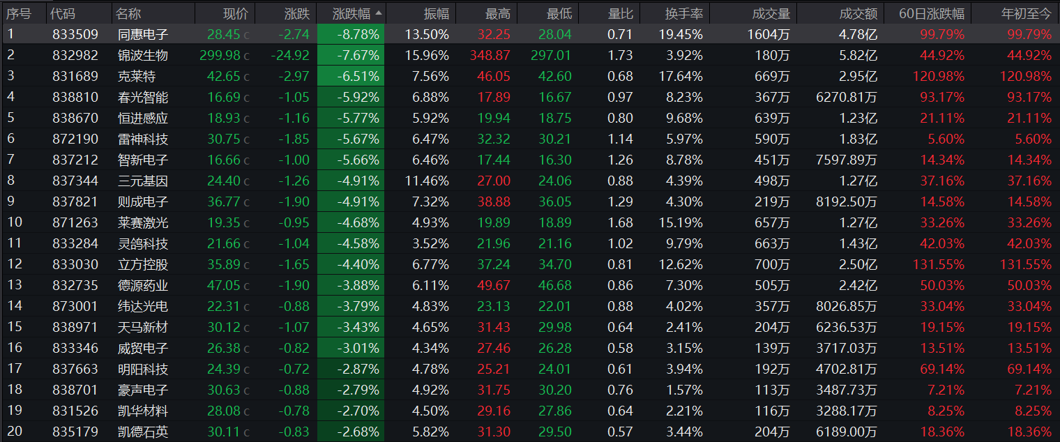 跌幅前五的是,同惠电子(833509)跌8.78%居首,锦波生物(832982)跌7.67%,克莱特(831689)跌6.51%,春光智能(838810)跌5.92%,恒进感应(838670)跌5.77%。