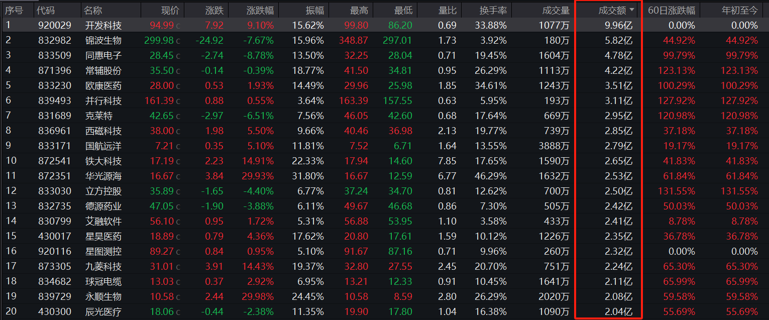 成交额前五的是,开发科技(920029)成交9.96亿元居首,锦波生物(832982)成交5.82亿元,同惠电子(833509)成交4.78亿元,常辅股份(871396)成交4.22亿元,欧康医药(833230)成交3.57亿元。