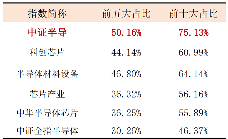 目前半导体设备ETF招商(561980)跟踪的中证半导,前十大集中度75%在同类半导体主题指数中是最高的,100%覆盖中微公司、北方华创、中芯国际、海光信息、南大光电、寒武纪等设备、材料、设计、制造龙头。