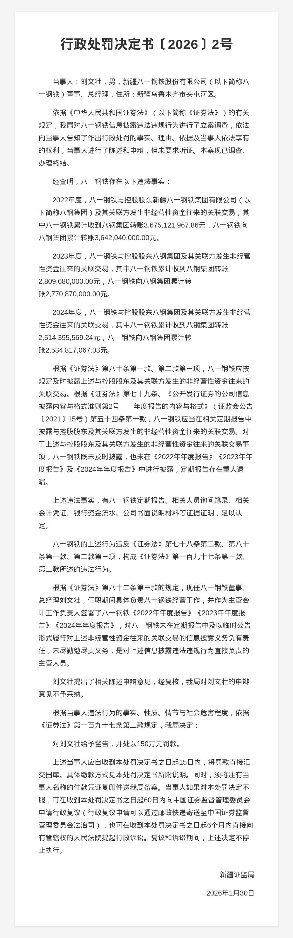 蓝鲸新闻2月4日讯,近日,新疆证监局发布行政处罚决定书,剑指新疆八一钢铁集团有限公司、新疆八一钢铁股份有限公司及相关责任人。