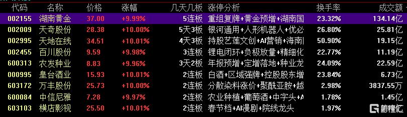 焦点股方面,AI应用概念股天地在线10天6板,并购重组的湖南黄金5连板,化工股百川股份3连板,机器人概念股天奇股份5天3板。