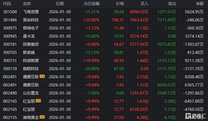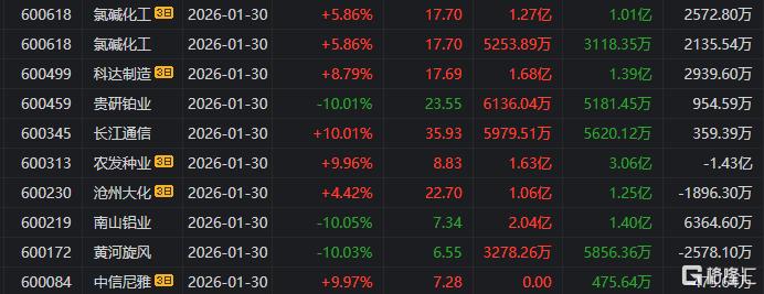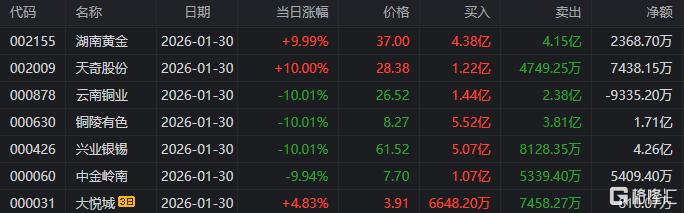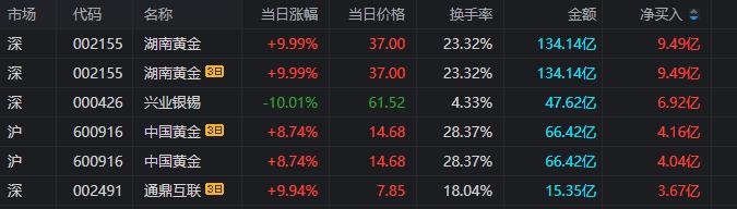 龙虎榜单日净买入额前三为湖南黄金、兴业银锡、中国黄金,分别为9.49亿元、6.92亿元、4.04亿元。