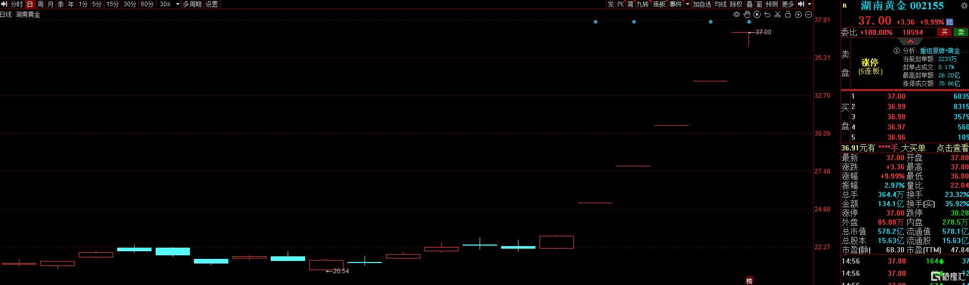 湖南黄金:今日涨停,已连续涨停5天,换手率23.32%,成交量364.41万手,成交额134.14亿元。龙虎榜数据显示,机构合计净卖出7.04亿元,北向资金合计净买入2368.76万元。