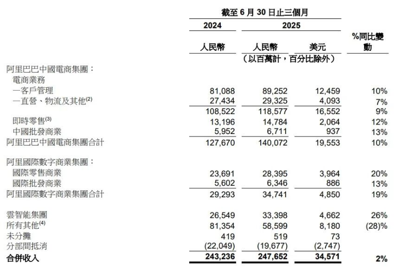 近日,阿里发布2026财年第一季度(自然年2025年第二季度)财报,当期营收2476亿元,同比微增2%,如果去掉已经卖出的高鑫零售和银泰,营收同比增长10%。