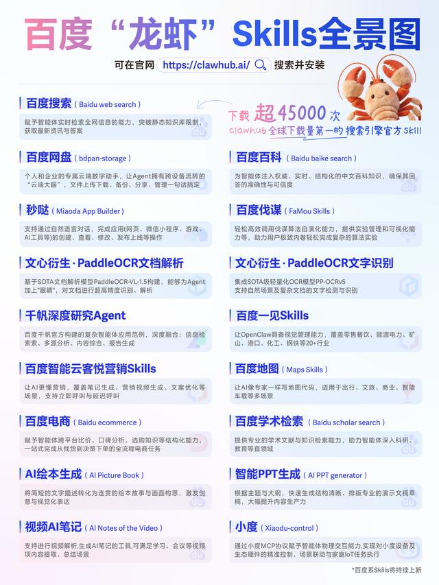 同时,百度还宣布上新多款Skills,其中百度搜索Skill下载量超4.5万次,是全球下载量最大的搜索引擎官方Skill,成为“龙虾必备”。