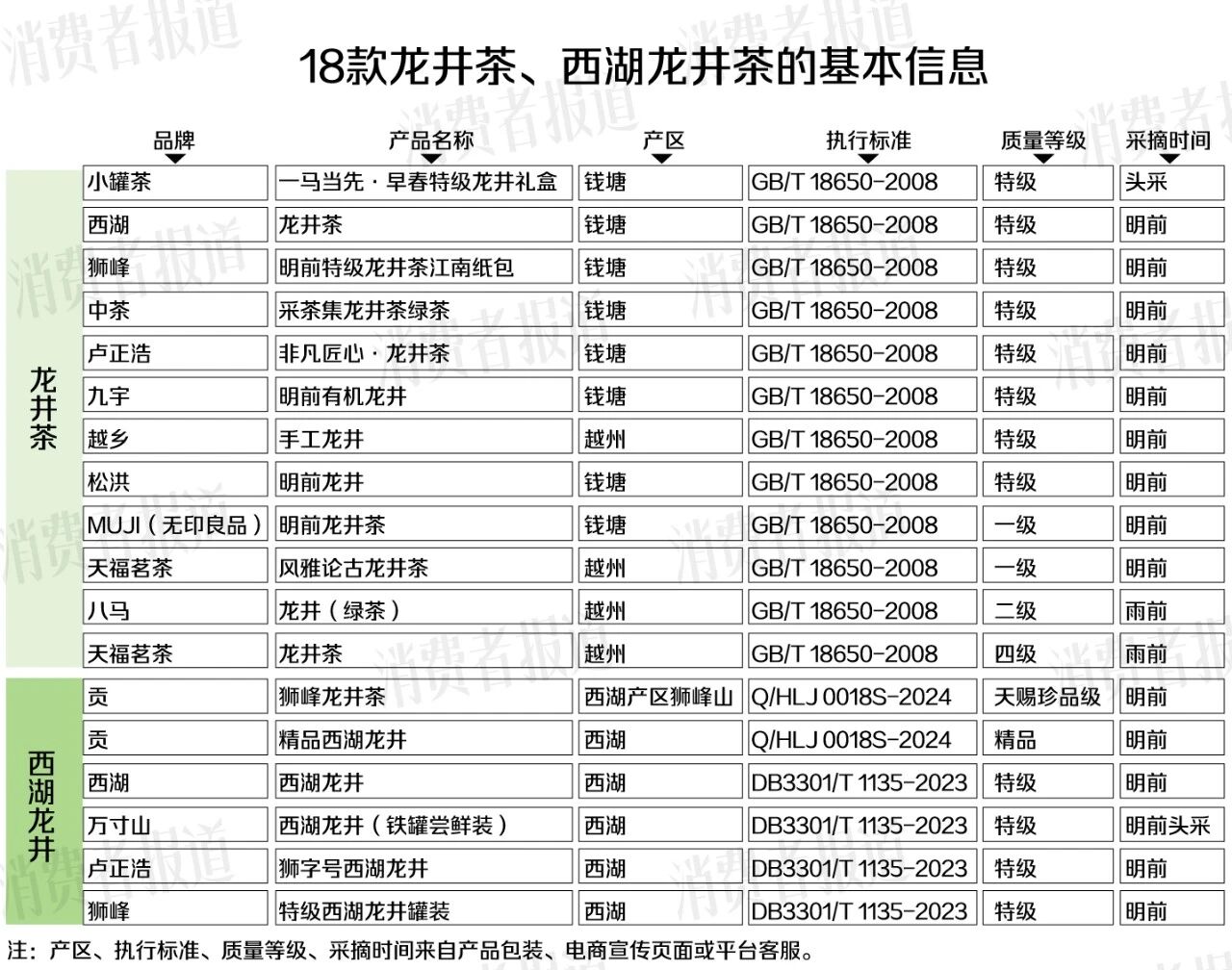 为了解龙井茶的产区、分级和价格情况,《消费者报道》记者对市面上12款龙井茶、6款西湖龙井进行了对比。