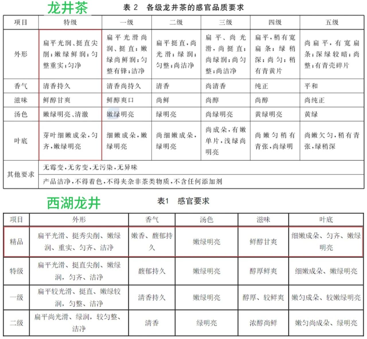 在分级上,龙井茶分为特级、一级、二级、三级、四级、五级6个等级,而西湖龙井分为精品、特级、一级、二级4个等级。