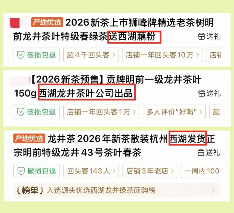 03. 送西湖藕粉、西湖发货……商家“碰瓷”西湖龙井套路多