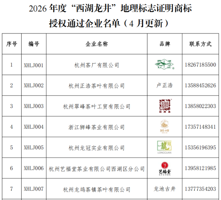 此外,截至4月2日,“西湖龙井茶管理协会”官网公布了182家2026年“西湖龙井”地理标志证明商标授权通过企业名单,购买前可以查询生产商是否有资质。