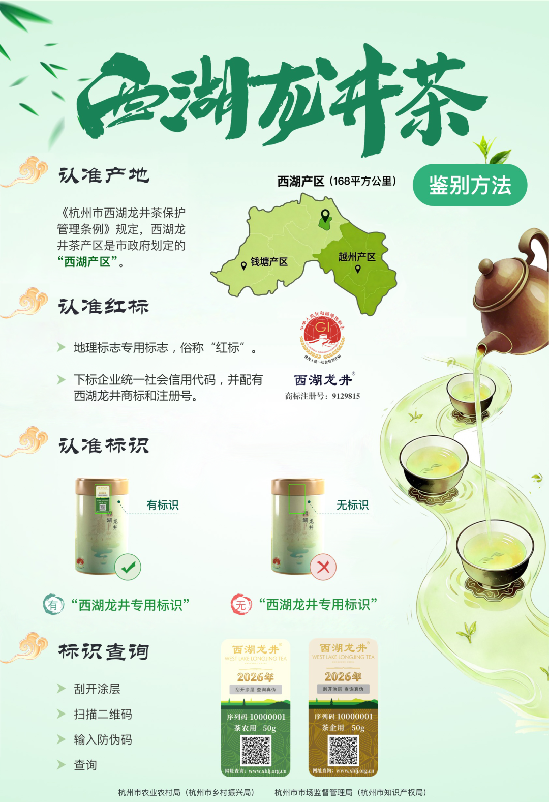 一是国家地理标志。正规产品包装上必须印有国家知识产权局核准的“中华人民共和国地理标志”(红标,注册号为9129815)。二是“西湖龙井专用标识”。根据《杭州市西湖龙井茶保护管理条例》,西湖龙井茶必须在包装显著位置加贴“西湖龙井专用标识”。