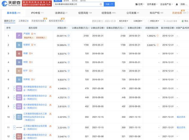 天眼查App信息显示,惠通科技成立于1998年12月,前称包括扬州汇通新合纤材料有限公司、扬州惠通化工技术有限公司等。目前,该公司的注册资本约1.05亿元,法定代表人为张建纲,主要股东包括严旭明、张建纲等。