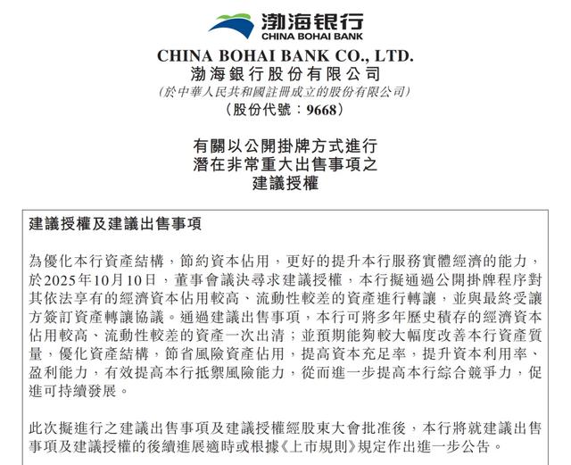 渤海银行表示,由于上述拟转让资产事项构成《香港上市规则》下的“非常重大出售事项”,需经股东大会批准。