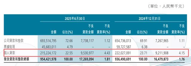 截至2025年6月末,该行个人贷款不良金额为95.31亿元,不良率为4.43%,同比分别上升3.46%和0.28个百分点。