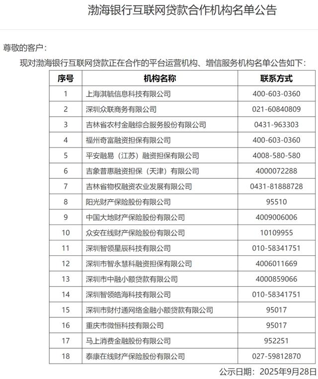 银信界注意到,今年9月28日,渤海银行官网披露了其互联网贷款合作机构名单,共计18家。和业内相比,渤海银行披露的内容较为简略,详见下图: