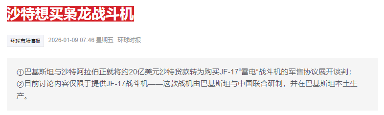 据报道,2名巴基斯坦消息人士透露,巴基斯坦与沙特阿拉伯正在就将约20亿美元的沙特贷款转为购买JF-17“雷电”战斗机(中国称“枭龙”)的军售协议展开谈判。