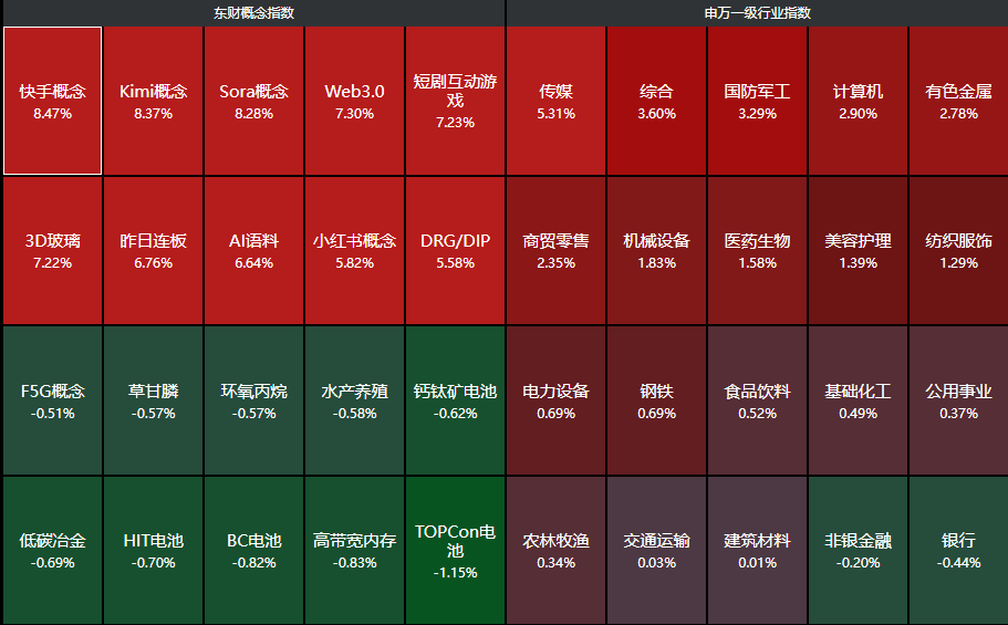 分行业来看,传媒、综合、国防军工、计算机、有色金属等行业领涨,银行、非银金融下跌。