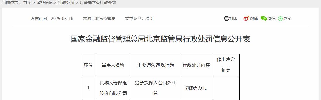 然而,回溯2025年,长城人寿亦在不同基础业务环节受到监管处罚。2025年5月16日,长城人寿保险股份有限公司因“给予投保人合同外利益”,被北京金融监管局处以5万元罚款。