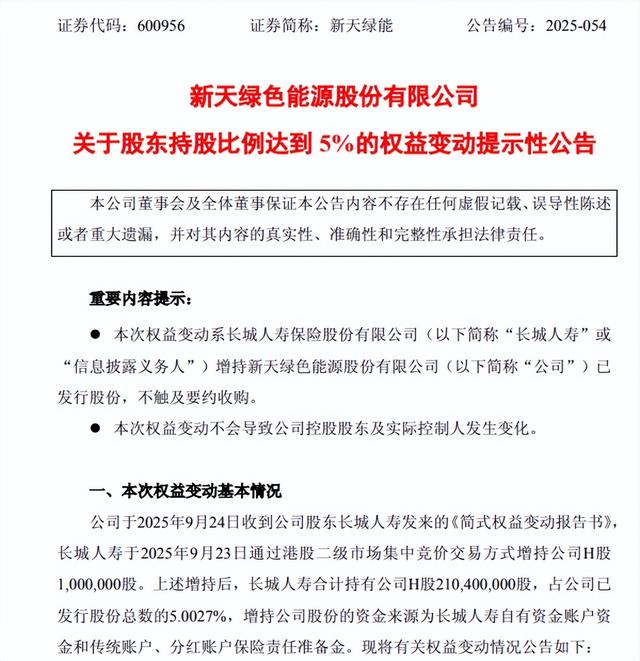 根据公开披露信息,2025年9月23日,长城人寿在二级市场增持新天绿能股票100万股,增持完成后,合计持有新天绿能股份约2.104亿股,占该公司总股本比例达到5.0027%。次日,即9月24日,新天绿色能源股份有限公司发布“关于股东持股比例达到5%的权益变动提示性公告”,对上述权益变动情况进行了信息披露。