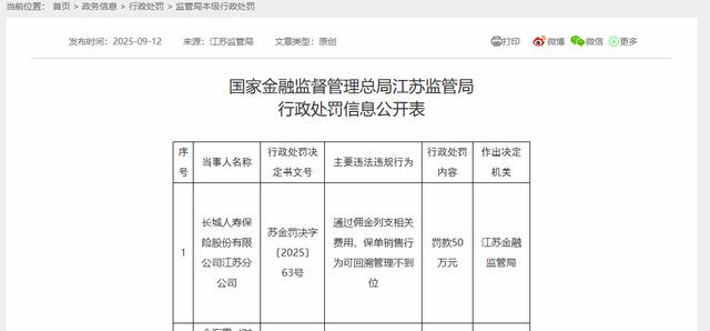9月12日,长城人寿保险股份有限公司江苏分公司因“通过佣金列支相关费用、保单销售行为可回溯管理不到位”,被江苏金融监管局处以50万元罚款。