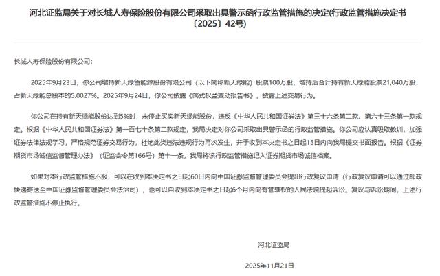 2025年12月9日,河北证监局对长城人寿保险股份有限公司(以下简称“长城人寿”)出具警示函,源于其在增持新天绿色能源股份有限公司(简称“新天绿能”)时,触及5%的持股比例红线后未停止交易。